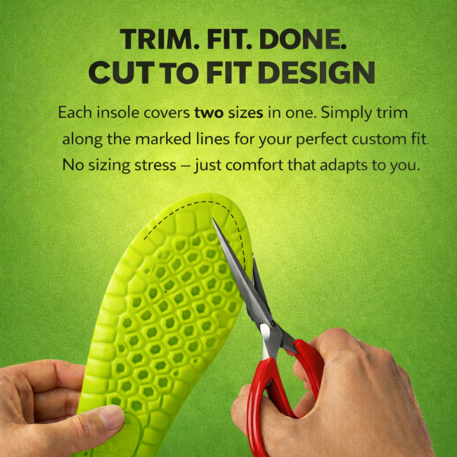 Each insole covers two sizes in one! Simply trim along the marked lines for your perfect custom fit. No need to worry about exact sizing – our adjustable design ensures comfort for everyone.